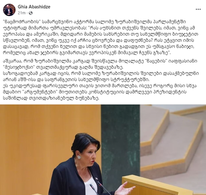 გია აბაშიძე – სალომე ზურაბიშვილზე: ეს უკიდურესად ფარისევლური თავის ვითომ მართლება, ისევე როგორც მისი სხვა მდაბიო “არგუმენტები” მიუთითებს კონსტიტუციის დამრღვევი პრეზიდენტის საშინლად თვითდაზიანებულ ბუნებაზე