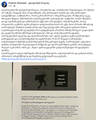 თბილისის საკრებულოს უმრავლესობის წევრი ვლადიმერ ბოჟაძე ინდიგო და ფრიდრიხ ებერტის ფონდის მიერ თბილისში დაგეგმილ პრეზენტაციას, თემაზე „პროტესტი და წინააღმდეგობა საქართველოში“, სოციალურ ქსელში ეხმიანება.