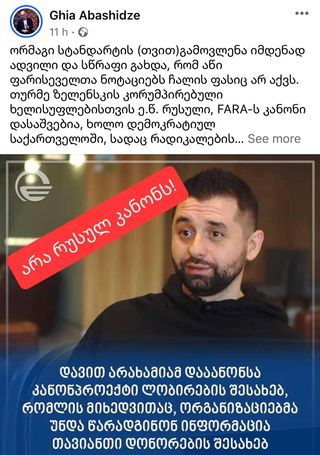 “ორმაგი სტანდარტის (თვით) გამოვლენა იმდენად ადვილი და სწრაფი გახდა, რომ აწი ფარისეველთა ნოტაციებს ჩალის ფასიც არ აქვს. თურმე, ზელენსკის კორუმპირებული ხელისუფლებისთვის ე.წ. რუსული, FARA-ს კანონი დასაშვებია, ხოლო დემოკრატიულ საქართველოში, სადაც რადიკალების ფსევდოარასამთავრობოები მთავრობის დამხობაზე მუშაობენ, არა.