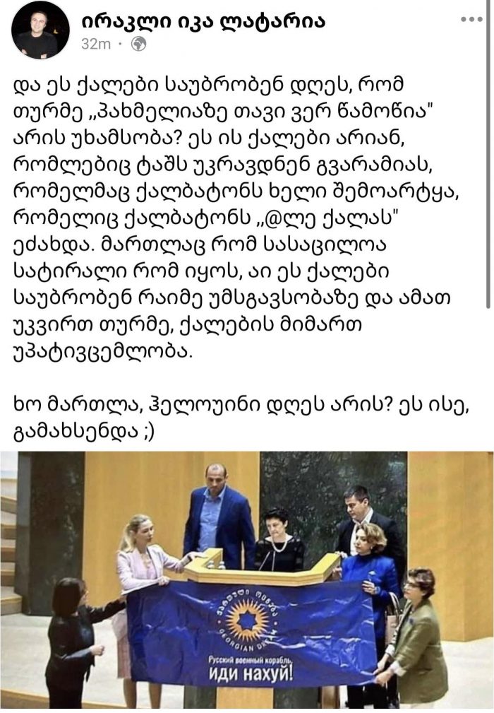 ირაკლი ლატარია – ოპოზიციონერ დეპუტატებზე: ეს ის ქალები არიან, რომლებიც ტაშს უკრავდნენ გვარამიას, რომელმაც ქალბატონს ხელი შემოარტყა, ამათ უკვირთ თურმე, ქალების მიმართ უპატივცემულობა
