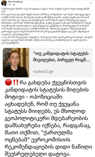 მისი გეოპოლიტიკური მდებარეობა მაშინაც საინტერესო იყო ჩვენი სტრატეგიული პარტნიორებისთვის, შეიძლება ბევრად მნიშვნელოვანი, ვიდრე ჩვენთვის მათთან ურთიერთობა და ახლაც ასე გრძელდება, მაშ რატომ იქეცით მონებად და ყველა ბრძანების უპირობო შემსრულებლებად, თუნდ ქვეყნის საზიანო ბრძანების? – ასე ეხმიანება ექსპერტი, ნინო ფოჩხუა ხატია დეკანოიძის და ხათუნა სამნიძის განცხადებებს, რომ თუ ჩვენ მივიღებთ კანდიდატის სტატუსს, ეს იქნება, გეოპოლიტიკური თვალსაზრისით.