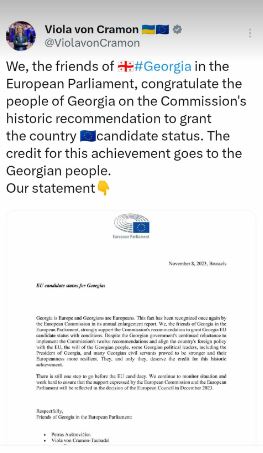 “ჩვენ, საქართველოს მეგობრები ევროპარლამენტში, ვულოცავთ, ქართველ ხალხს კომისიის მიერ ისტორიული რეკომენდაციის გაცემას, რომ ქვეყანას ევროკავშირის კანდიდატის სტატუსი მიენიჭოს. ეს ქართველი ხალხის დამსახურებაა”, – წერს ვიოლა ფონ კრამონი.