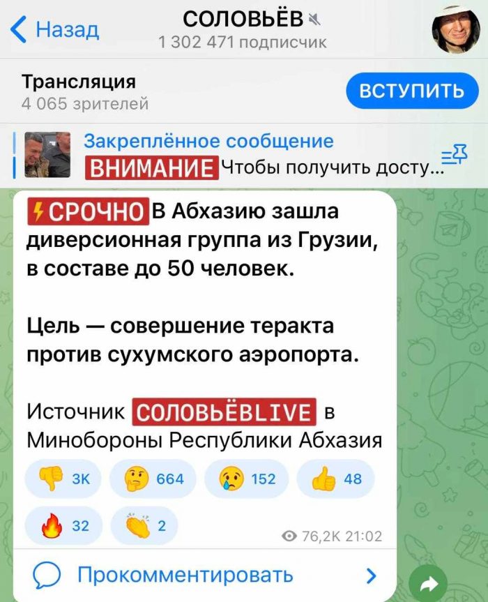 ამის პარალელურად, СоловьевLIVE-ის ტელეგრამის არხზე გავრცელდა ექსკლუზიური ინფორმაცია, რომ “აფხაზეთში საქართველოდან 50-კაციანი დივერსიული ჯგუფი შევიდა. მათი მიზანია – სოხუმის აეროპორტში ტერაქტის მოწყობა”. აღინიშნებოდა, რომ ინფორმაცია მიღებულია აფხაზეთის ე.წ.თავდაცვის სამინისტროდან.