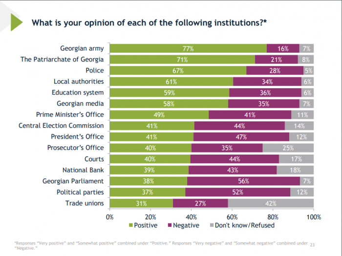 მათივე ცნობით, საზოგადოება წინა წელთან შედარებით, წელს კიდევ უფრო მეტად ენდობა პროფკავშირების საქმიანობას. თუ შარშან 27% აფასებდა ორგანიზაციის საქმიანობას დადებითად, წელს ეს მაჩვენებელი 31%-მდე გაიზარდა. ასევე, მკვეთრად, მთელი 6%-ით არის შემცირებული ნეგატიური შეფასების მაჩვენებელიც, რომელმაც 33-დან 27%-მდე დაიწია და ჩამოთვლილი თხუთმეტი ინსტიტუტიდან, ჯარისა და ეკლესიის შემდეგ, პროფკავშირების საქმიანობას ყველაზე ნაკლები უარყოფითი შეფასება აქვს.