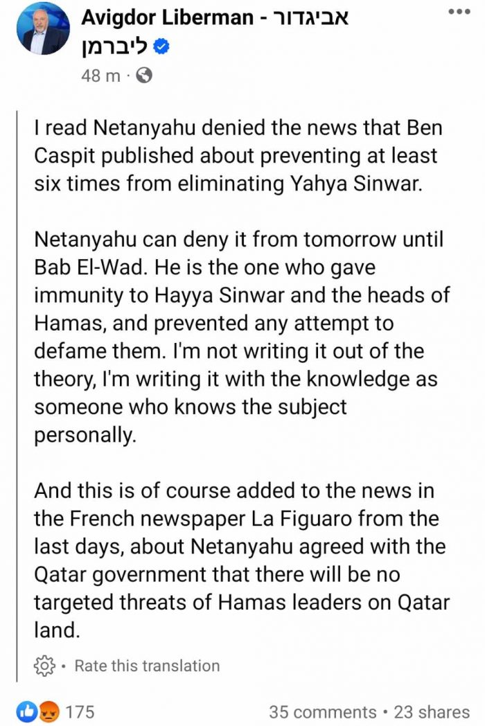 პარტია „ისრაელი ჩვენი სახლის“ ხელმძღვანელი, სხვადასხვა დროს ისრაელის რამდენიმე სამინისტროს უფროსი, ავიგდორ ლიბერმანი ისრაელელი ჟურნალისტის, ბენ მერკურის ინფორმაციას გამოეხმაურა, რომ, თითქოს, ბენიამინ ნეთანიაჰუმ “ჰამასის” ლიდერის, იაჰია სინვარის ლიკვიდაციას, „სულ მცირე, ექვსჯერ აარიდა თავი“.