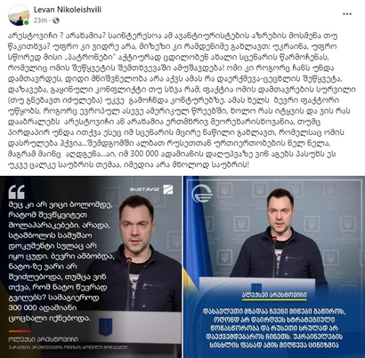 „არესტოვიჩი ? არახამია? საინტერესოა ამ ავანტიურისტების აზრების მოსმენა თუ წაკითხვა? უფრო კი ვიდრე არა, მიზეზი კი რამდენიმე გახლავთ: უკრაინა, უფრო სწორედ მისი „პატრონები“ აქტიურად ცდილობენ ახალი სცენარის წარმოჩენას, რომელიც ომის შეწყვეტის შემთხვევაში ამუშავდება! ომი კი, როგორც ჩანს, უნდა დამთავრდეს, დიდი მნიშვნელობა არა აქვს, ამას რა დაერქმევა-ცეცხლის შეწყვეტა, დაზავება, გაყინული კონფლიქტი თუ სხვა რამ, ფაქტია ომის დამთავრების სურვილი (თუ გნებავთ იძულება) უკვე გამოჩნდა კონტურებზე. ამას ხელს ბევრი ფაქტორი უწყობს, როგორც ევროპულ ასევე ამერიკულ წრეებში, ხოლო რას იტყვის და ვის რას დააბრალებს არესტოვიჩი ან არახამია, ერთი მხრივ, მეორეხარისხოვანია, თუმცა, პირდაპირ უნდა ითქვა ესეც იმ სცენარის მცირე ნაწილი გახლავთ, რომელსაც ომის დასრულება ჰქვია… შემდგომში ალბათ რუსეთთან ურთიერთობების ნელ- ნელა, მაგრამ მაინც აღდგენა…აი, იმ 300 000 ადამიანის დაღუპვაზე ვინ აგებს პასუხს ეს უკვე ცალკე საუბრის თემაა, იმედია არა მხოლოდ საუბრის!“, – წერს ლევან ნიკოლეიშვილი Facebook-ზე.