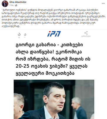 “ქართული ოცნების” გუნდის მოღალატემ, გიორგი გახარიამ არ გასცა პასუხები საზოგადოებას რეალურად თუ რატომ გაიქცა პრემიერის პოსტიდან”, – ამის შესახებ ანალიტიკოსი, გია აბაშიძე სოციალურ ქსელში წერს.