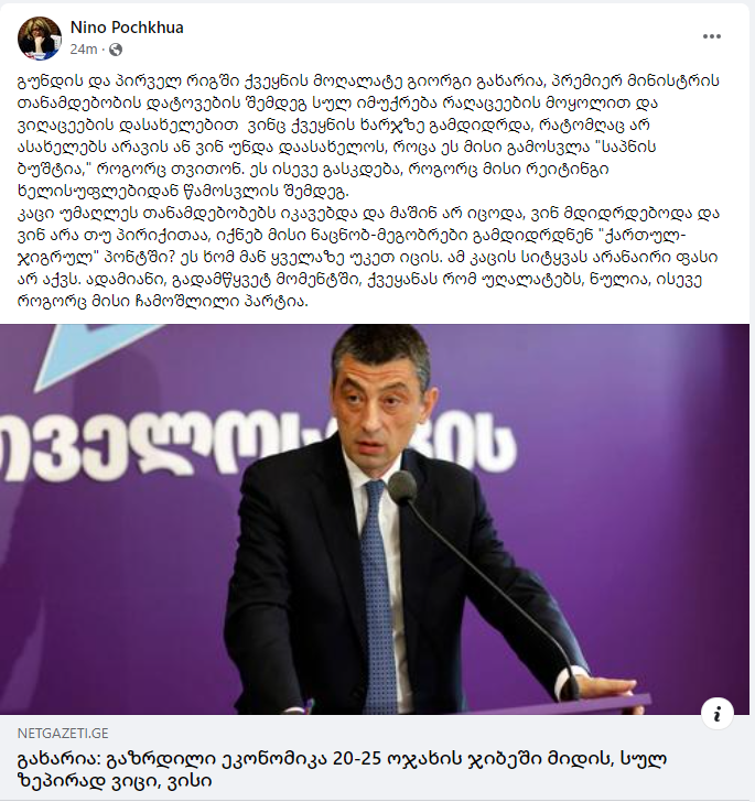 „გუნდის და, პირველ ყოვლისა, ქვეყნის მოღალატე გიორგი გახარია, პრემიერმინისტრის თანამდებობის დატოვების შემდეგ სულ იმუქრება რაღაცების მოყოლით და ვიღაცების დასახელებით, ვინც ქვეყნის ხარჯზე გამდიდრდა, რატომღაც არ ასახელებს არავის ან ვინ უნდა დაასახელოს, როცა ეს მისი გამოსვლა “საპნის ბუშტია,” როგორც თვითონ. ეს ისევე გასკდება, როგორც მისი რეიტინგი ხელისუფლებიდან წამოსვლის შემდეგ.