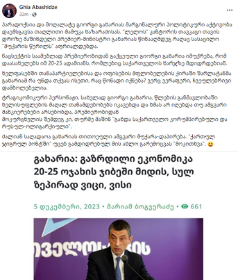 ძალიან საღადაოა გახარიას თითოეული ამგვარი მუქარა-დაპირება. “ქართულ ჯიგრულ პონტში” უცებ გამდიდრებულ მის ახლო გარემოცვას “მოკითხვა”.” – წერს გია აბაშიძე Facebook-ზე.