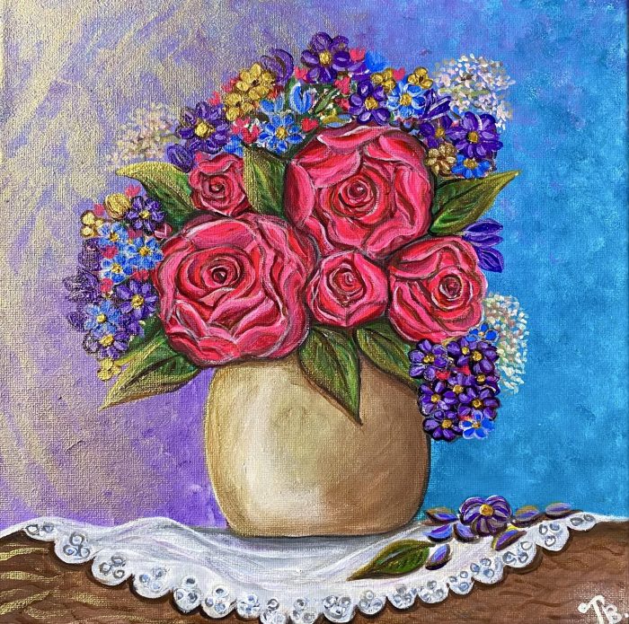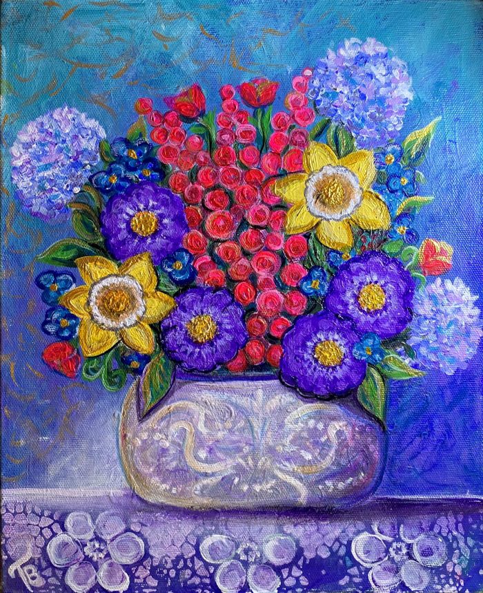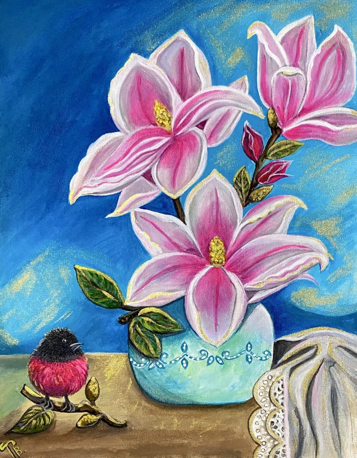 – მადლობა, რომ გრძნობთ ამას! ამ ეტაპზე გამოვარჩევდი „ნარცისებს“, ძალიან მომწონს ფერები… მეორე ნამუშევარია: „ვარდისფერი რობინი და მაგნოლია“.