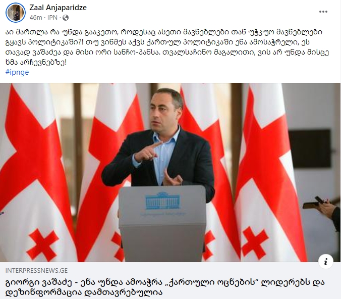 ანჯაფარიძის თქმით, ვაშაძის განცხადება – “ვის დეზინფორმაციას უნდა ებრძოლოს “ქართული ოცნება”? ენა უნდა ამოაჭრა “ქართული ოცნების” ლიდერებს და დეზინფორმაცია დამთავრებულია” – იმის ნათელი მაგალითია, თუ ვის არ უნდა მისცეს ამომრჩეველმა ხმა მომავალ არჩევნებზე.