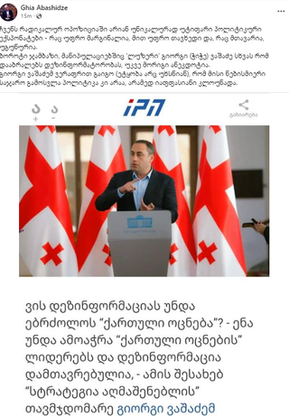 ანალიტიკოსი, გია აბაშიძე გიორგი ვაშაძის განცხადებას, რომ „ენა უნდა ამოაჭრა „ქართული ოცნების“ ლიდერებს და დეზინფორმაცია დამთავრებულია“, სოციალურ ქსელში აფასებს.