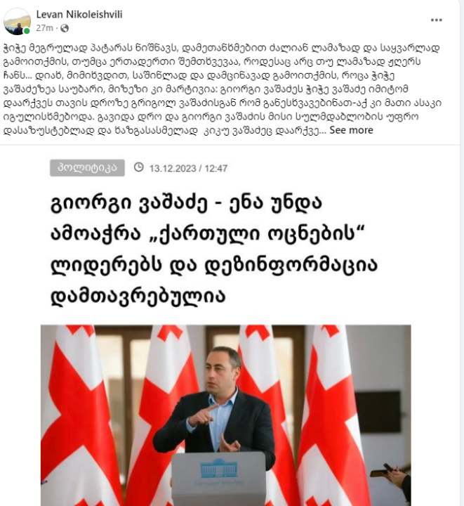 მართალი ყოფილა ის ხალხი, ვინც გიორგი ვაშაძეს ჯერ “ჭიჭე” და მერე “კიკუ” დაარქვა! არა, არ ეშლება ხალხს არაფერი-შესაბამისად ჭიჭეს კიკუ დაარქვა, აბა, რა უნდა დაერქმია ასეთი პერსონაჟისთვის?, – ამის შესახებ ექსპერტი, ლევან ნიკოლეიშვილი გიორგი ვაშაძის იმ განცხადების საპასუხოდ წერს, სადაც აღნიშნულია, რომ “ენა უნდა ამოაჭრა “ქართული ოცნების” ლიდერებს და დეზინფორმაცია დამთავრებულია”.