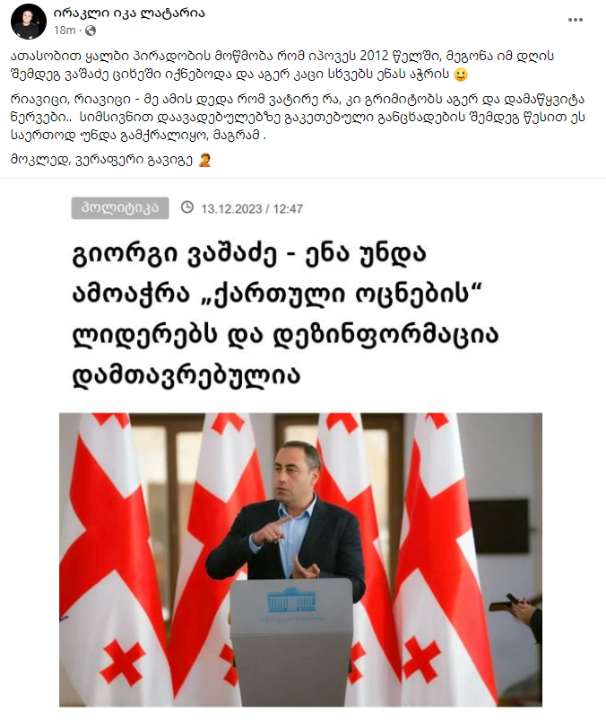 „ათასობით ყალბი პირადობის მოწმობა რომ იპოვეს 2012 წელს, მეგონა, იმ დღის შემდეგ ვაშაძე ციხეში იქნებოდა და აგერ კაცი სხვებს ენას აჭრის“, – ასე ეხმიანება ექსპერტი, ირაკლი ლატარია გიორგი ვაშაძის განცხადებას, რომ „ენა უნდა ამოაჭრა „ქართული ოცნების“ ლიდერებს და დეზინფორმაცია დამთავრებულია“.