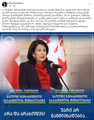 „აი, ამ ქალს აბრალებენ პოლიტიკოსობას და დიპლომატობას. ქალი ხან ერთს ამბობს და ხან მეორეს, საკუთარი პრინციპი და პოზიცია არ გააჩნია, პრინციპს ვინ დაეძებს, პირადი გამორჩენის მიზნით, კრიმინალებთან ალიანსშია, აბა რა გამოდის, უმძიმეს დანაშაულში ბრალდებულებს არ გაუღო ციხის კარი? ახლა სააკაშვილი და ლაზარე დარჩა შესაწყალებელი და მისი მისიაც ამ საკითხში ამოწურულად ჩაითვლება. ვნახოთ შემდეგი დავალება რა იქნება. უდიდესი შეცდომა იყო ამ ქალის, პრეზიდენტად კი არა, ქართულ პოლიტიკასთან მიახლოებაც კი. თურმე მართალი იყო მიშა, როცა მოისროლა პოლიტიკურ სანაგვეზე“, -წერს ნინო ფოჩხუა სოციალურ ქსელში.