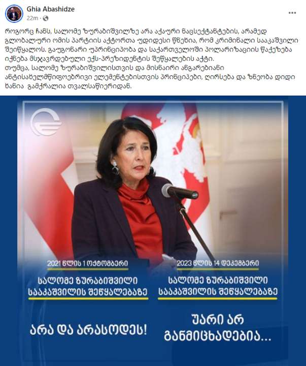 „როგორც ჩანს, სალომე ზურაბიშვილზე არა აქაური ნაცსექტანტების, არამედ გლობალური ომის პარტიის აქტორთა უდიდესი წნეხია, რომ კრიმინალი სააკაშვილი შეიწყალოს. გაუგონარი უპრინციპობა და საქართველოში პოლარიზაციის წაქეზება იქნება მსჯავრდებული ექსპრეზიდენტის შეწყალების აქტი.