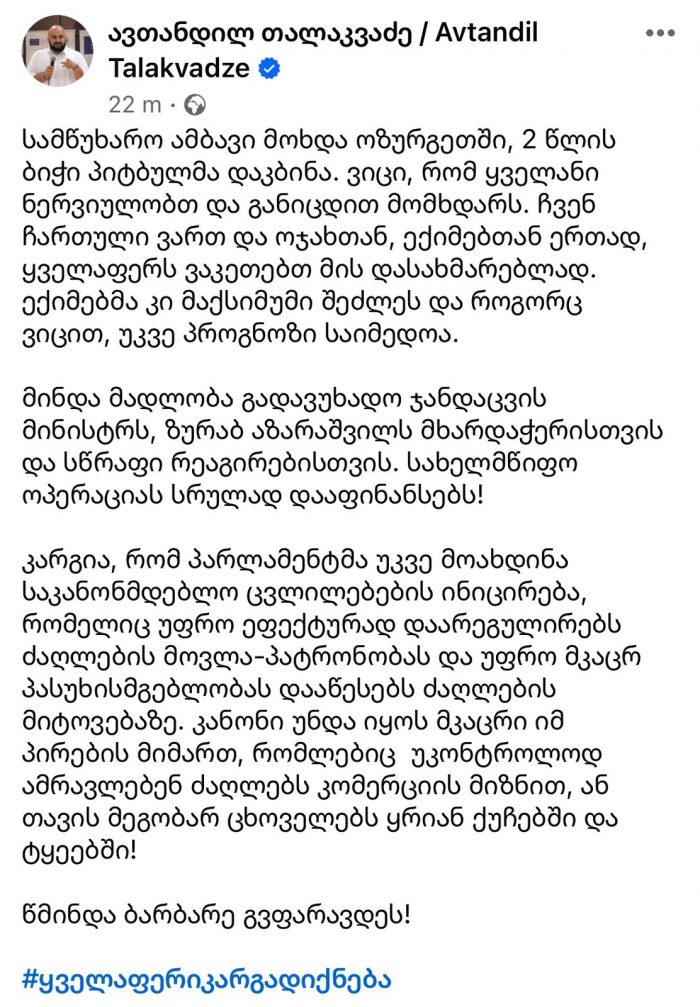 “სამწუხარო ამბავი მოხდა ოზურგეთში, 2 წლის ბიჭი პიტბულმა დაკბინა. ვიცი, რომ ყველანი ნერვიულობთ და განიცდით მომხდარს. ჩვენ ჩართული ვართ და ოჯახთან, ექიმებთან ერთად, ყველაფერს ვაკეთებთ მის დასახმარებლად. ექიმებმა კი მაქსიმუმი შეძლეს და როგორც ვიცით, უკვე პროგნოზი საიმედოა.