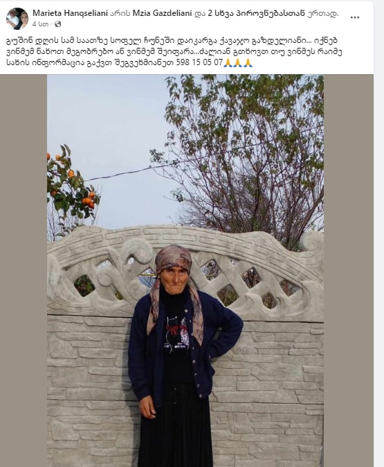 “გუშინ დღის სამ საათზე სოფელ ჩუნეში დაიკარგა ქავაჯო გაზდელიანი… იქნებ, ვინმემ ნახოთ, მეგობრებო ან ვინმემ შეიფარა…ძალიან გთხოვთ, თუ ვინმეს რაიმე სახის ინფორმაცია გაქვთ, შეგვეხმიანეთ 598 15 05 07”,- წერს ოჯახის ახლობელი.