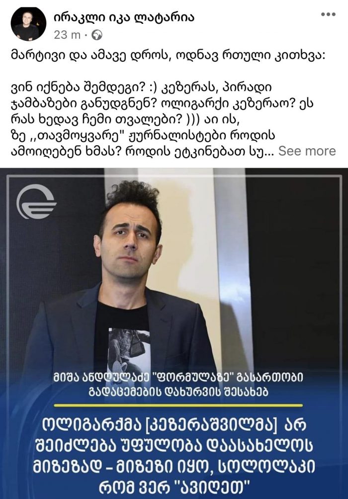 „მარტივი და ამავე დროს, ოდნავ რთული კითხვა: ვინ იქნება შემდეგი? კეზერას, პირადი ჯამბაზები განუდგნენ? ოლიგარქი კეზერაო? ეს რას ხედავ ჩემი თვალები? აი ის, ზე ,,თავმოყვარე” ჟურნალისტები როდის ამოიღებენ ხმას? როდის ეტკინებათ სული, ნაძარცვი ჯარითა და ევროპელ პენსიონრებზე წართმეული ფულით რომ ბლატაობენ? ეგეც იქნება, თანაც მალე“-წერს ირაკლი ლატარია სოციალურ ქსელში.