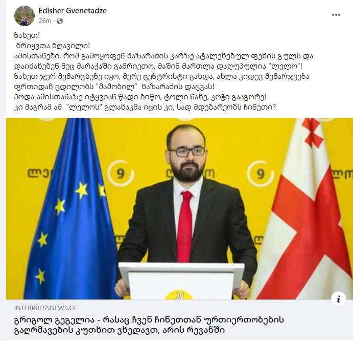 ედიშერ გვენეტაძე გრიგორ გეგელიაზე: ნახეთ ჯერ მემარცხენე იყო, მერე ცენტრისტი გახდა, ახლა კიდევ მემარჯვენე ფრთიდან ცდილობს “მამობილ” ხაზარაძის დაცვას!