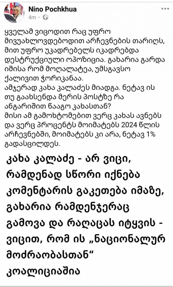 მისი ამ გამოხტომებით ვერც კახას ავნებს და ვერც პროცენტს მოიმატებს 2024 წლის არჩევნებში, მოიმატებს კი არა, ნეტავ 1% გადასცილდეს”, – წერს ნინო ფოჩხუა.