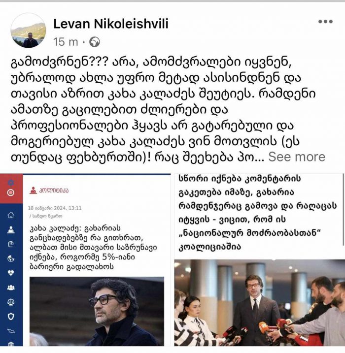 „გამოძვრნენ??? არა, ამომძვრალები იყვნენ, უბრალოდ, ახლა უფრო მეტად ასისინდნენ და, თავიანთი აზრით, კახა კალაძეს შეუტიეს. რამდენი ამათზე გაცილებით ძლიერები და პროფესიონალები ჰყავს არ გატარებული და მოგერიებულ კახა კალაძეს ვინ მოთვლის (ეს თუნდაც ფეხბურთში)! რაც შეეხება პოლიტიკას არც ეს გაუჭირდება, თუმცა რა პოლიტიკა რის პოლიტიკა ესენი ხომ ჩვეულებრივი მავნებელ-გადამგდებები არიან, რომლებსაც ჰგონიათ რომ პოლიტიკა ცბიერებისთვის, მევახშეებისა და მოღალატეების ნავსაყუდელია. ძალიან ცდებიან და ამის დადასტურება ძალიან მალე არჩევნებზე მოხდება, 5 % ბარიერის გადალახვა ადვილი ჰგონიათ ან სულაც ნაციონალების 5 ნომერი, რომელსაც ხან აქედან მიეტმასნებიან და ხან იქიდან!“, – წერს ლევან ნიკოლეიშვილი.