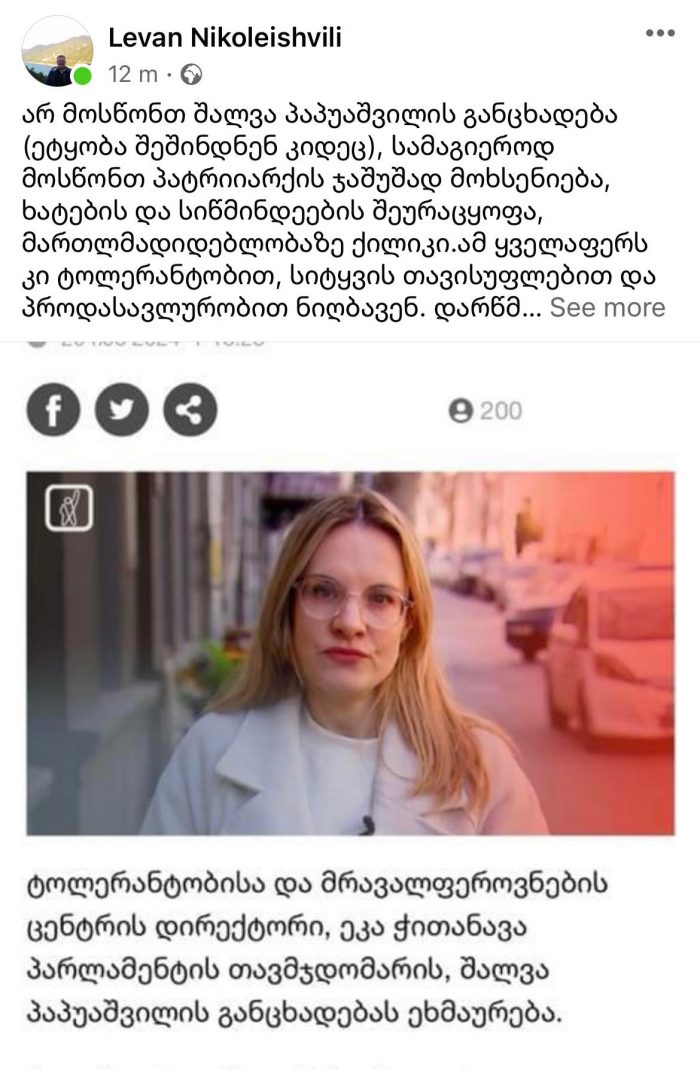 „არ მოსწონთ შალვა პაპუაშვილის განცხადება, სამაგიეროდ მოსწონთ რომ ვიღაც ვიგინდარები პატრიარქს ჯაშუშს უწოდებენ და 7 იანვარს შობის აღნიშვნას ეწინააღმდეგებიან, ხატებსა თუ წმინდანებს შეურაცხყოფენ – ერთი ეს დარჩათ ეკლესიებს დასანგრევად მიადგნენ. ამ ყველაფერს კი ხან ტოლერანტობით, ხანაც პროდასავლეთელობით ნიღბავენ. გასაგებია, რომ არც კაცის ეშინიათ და არც ღმერთის, თუმცა მოკითხვაც და განკითხვაც აუცილებლად მოუწევთ”, – წერს ლევან ნიკოლეიშვილი Facebook-ზე.