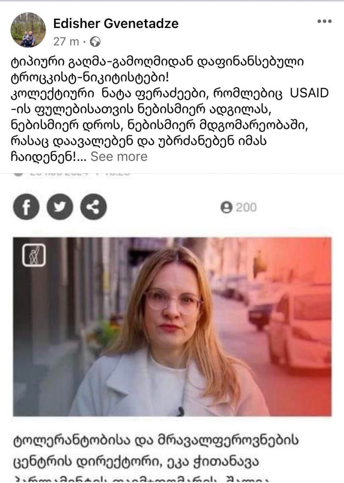 ედიშერ გვენეტაძე – ეკა ჭითინავას განცხადებებზე: კოლექტიური ნატა ფერაძეები, რომლებიც USAID-ის ფულებისათვის ნებისმიერ მდგომარეობაში, რასაც დაავალებენ და უბრძანებენ, იმას ჩაიდენენ! ამათთვის არ არსებობს არავითარი ზნეობრივი და არავითარი ქართული