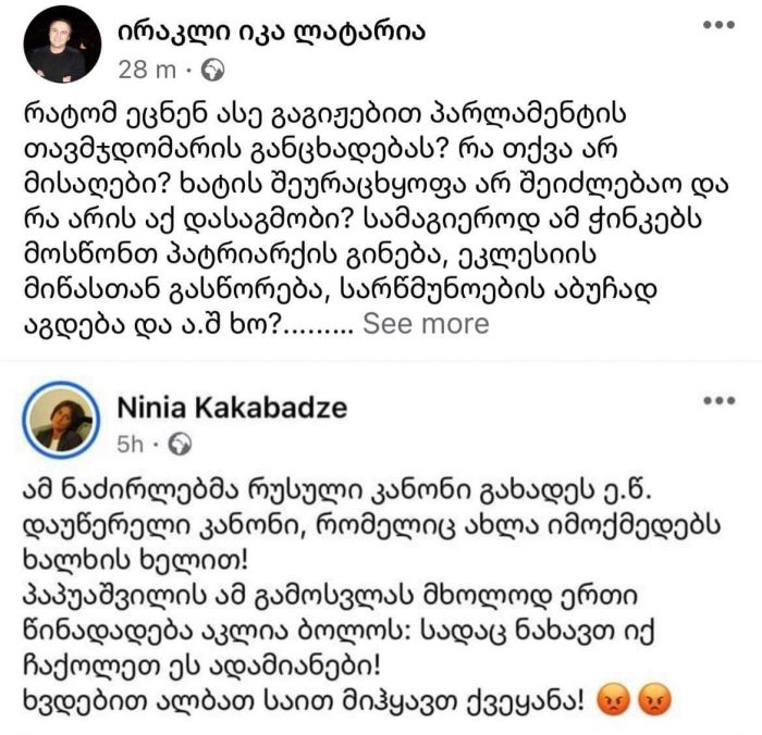 „რატომ ეცნენ ასე გაგიჟებით პარლამენტის თავმჯდომარის განცხადებას? რა თქვა არ მისაღები? ხატის შეურაცხყოფა არ შეიძლებაო და რა არის აქ დასაგმობი? სამაგიეროდ ამ ჭინკებს მოსწონთ პატრიარქის გინება, ეკლესიის მიწასთან გასწორება, სარწმუნოების აბუჩად აგდება და ა.შ ხომ?……