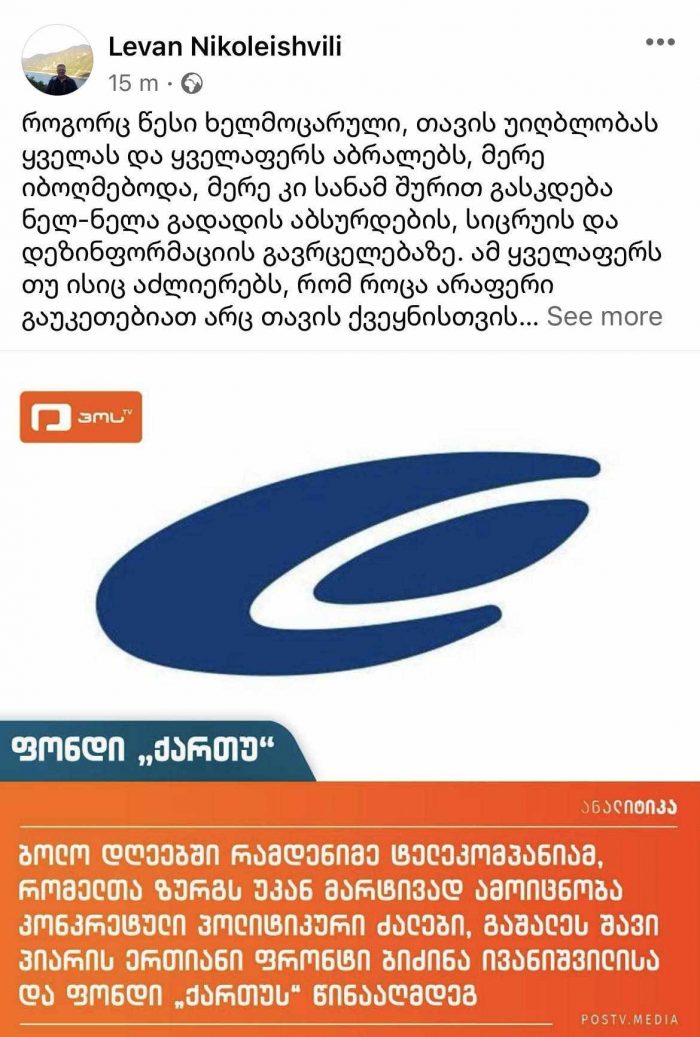 ექსპერტი, ლევან ნიკოლეიშვილი ფონდ „ქართუს“ განცხადებას სოციალურ ქსელში ეხმიანება, სადაც აღნიშნულია, რომ „ბოლო დღეებში რამდენიმე ტელეკომპანიამ, რომელთა ზურგს უკან მარტივად ამოიცნობა კონკრეტული პოლიტიკური ძალები, გაშალეს შავი პიარის ერთიანი ფრონტი ბიძინა ივანიშვილისა და ფონდ „ქართუს“ წინააღმდეგ”.