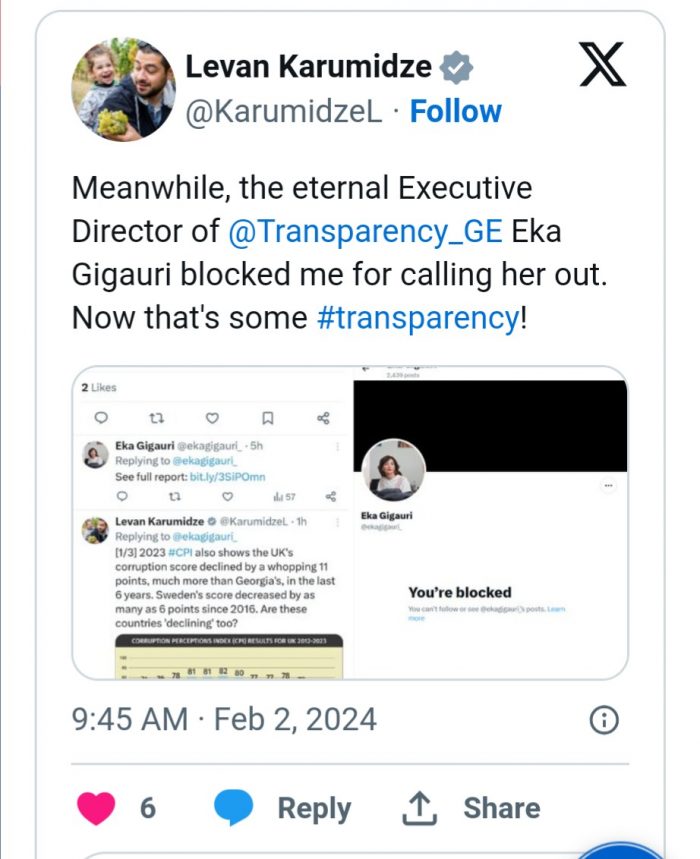 „საერთაშორისო გამჭვირვალობა საქართველოს“ აღმასრულებელმა დირექტორმა ეკა გიგაურმა სოციალურ ქსელში დაბლოკა „ქართული ოცნების” დეპუტატი ლევან ქარუმიძე, რომელმაც „ენჯეო“ სექტორის წარმომადგენელი გიგაური კორუფციის აღქმის ინდექსით მანიპულირებაში ამხილა.