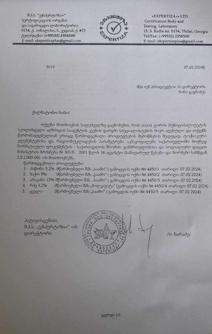 “შპს ენ პროდუქტი”-ის მერ საჯარო ბაღებში შეტანილი საკვები პროდუქტებიდან აღებული ნიმუშების შემოწმების შედეგად, რომლის ლაბორატორიული კვლევა “შპს ექსპერტიზა +”-ის მიერ ჩატარდა, დადგინდა, რომ ტოქსიკური ელემენტებისა და რადიონუკლიდების პარამეტრები სრულად აკმაყოფილებს საქართველოში მოქმედი, შრომის, ჯანმრთელობისა და სოციალური დაცვის ნორმატიული დოკუმენტის მოთხოვნებს.