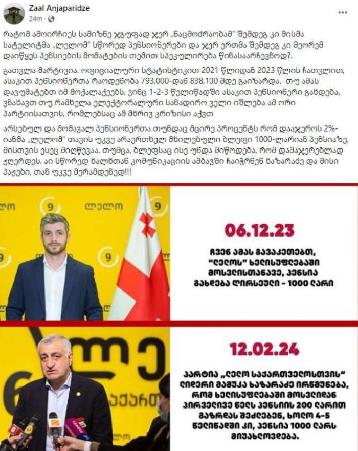 “რატომ ამოირჩიეს სამიზნე ჯგუფად ჯერ „ნაცმოძრაობამ“ შემდეგ კი მისმა სატელიტმა „ლელომ“ სწორედ პენსიონერები და ჯერ ერთმა შემდეგ კი მეორემ დაიწყეს პენსიების მომატების თემით სპეკულირება წინასაარჩევნოდ?