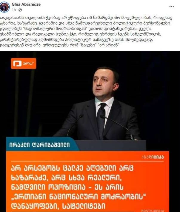 გია აბაშიძე: იაფფასიანი თვალთმაქცობაც არ ეწოდება იმ სამარცხვინო მოცემულობას, როდესაც გახარია, ხაზარაძე, გვარამია და სხვა პოლიტიკური პერსონაჟები ცდილობენ “ნაციონალური მოძრაობისგან” ვითომ დისტანცირებას