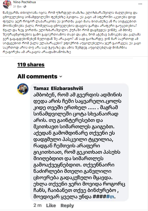 “ნახევარმა თბილისმა იცის, რომ უზრდელ თამაზა ელიზბარაშვილს ძაღლებიც და ცხოველებიც სინამდვილეში ფეხებზე ჰკიდია. ეს კაცი ამ სფეროში აკეთებს დიდ ფულს. ჯერ როგორ ლაპარაკობს ეს ვირთხა კაცი მაია ბითაძეზე ან რა სიტყვებით მოიხსენიებს ქალს, რომელსაც ცხოველების დაცვის გარდა არაფერი გაუკეთებია? ხვალ და ზეგ ვირთხა ელიზბარაშვილო, ქუჩაში რომ დაგხვდეს ვინმე, ამ მძიმე შეურაცხყოფების გამო გაგიერთიანოს თავი და ყბა, ხომ ატეხავ პანიკებს და კალამს ვერ გაგაგდებინებენ ხელიდან შე არაკაცო? ან სად გაიზარდე, ვინ ხარ საერთოდ ამ სიტყვებით რომ ქალს ელაპარაკები? ვფიქრობ აუცილებელია ჯერ გაირკვეს, ეს კაცი საერთოდ არის თუ არა საღ ჭკუაზე და ამის შემდეგ აუცილებლად მიმაჩნია რეაგირება ამ არაკაცის არაადამიანობაზე”, – წერს ნინო ფოჩხუა სოციალურ ქსელში.