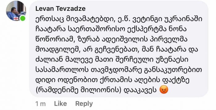 “ერთსაც მივამატებდი, ე.წ. ვეტინგი უკრაინაში ჩაატარა საერთაშორისო ექსპერტმა ნონა წოწორიამ, ზურაბ ადეიშვილის პირველმა მოადგილემ, არ გეჩვენებათ, მან ჩაატარა და ძალიან მალევე მათი შერჩეული უზენაესი სასამართლოს თავმჯდომარე განსაკუთრებით დიდი ოდენობით ქრთამის აღების ფაქტზე (რამდენიმე მილიონის) დააკავეს” – წერს ლევან თევზაძე.
