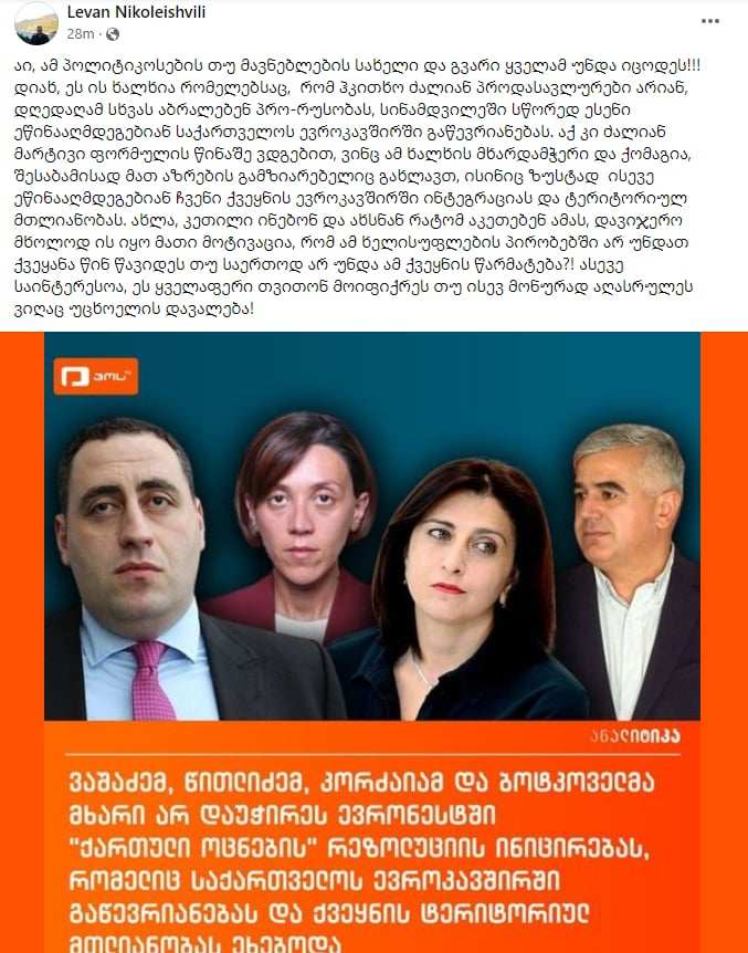 “აი, ამ პოლიტიკოსების თუ მავნებლების სახელი და გვარი ყველამ უნდა იცოდეს!!! დიახ, ეს ის ხალხია რომლებსაც, რომ ჰკითხო ძალიან პროდასავლურები არიან, დღედაღამ სხვას აბრალებენ პრო-რუსობას, სინამდვილეში სწორედ ესენი ეწინააღმდეგებიან საქართველოს ევროკავშირში გაწევრიანებას. აქ კი ძალიან მარტივი ფორმულის წინაშე ვდგებით, ვინც ამ ხალხის მხარდამჭერი და ქომაგია, შესაბამისად მათ აზრების გამზიარებელიც გახლავთ, ისინიც ზუსტად ისევე ეწინააღმდეგებიან ჩვენი ქვეყნის ევროკავშირში ინტეგრაციას და ტერიტორიულ მთლიანობას. ახლა, კეთილი ინებონ და ახსნან რატომ აკეთებენ ამას, დავიჯერო მხოლოდ ის იყო მათი მოტივაცია, რომ ამ ხელისუფლების პირობებში არ უნდათ ქვეყანა წინ წავიდეს თუ საერთოდ არ უნდა ამ ქვეყნის წარმატება?! ასევე საინტერესოა, ეს ყველაფერი თვითონ მოიფიქრეს თუ ისევ მონურად აღასრულეს ვიღაც უცხოელის დავალება!” – წერს ნიკოლეიშვილი Facebook-ზე.