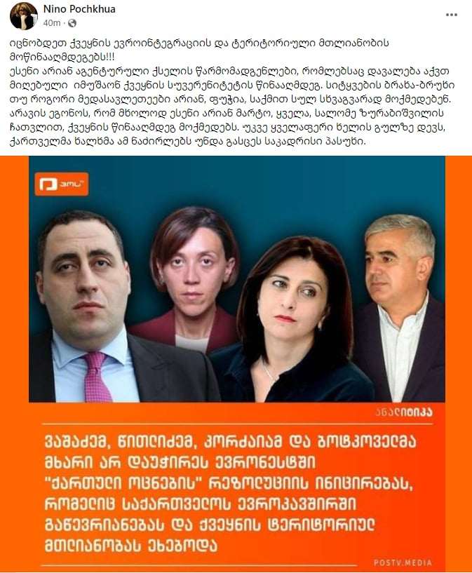 იცნობდეთ ქვეყნის ევროინტეგრაციის და ტერიტორიული მთლიანობის მოწინააღმდეგეებს!!! ესენი არიან აგენტურული ქსელის წარმომადგენლები, რომლებსაც დავალება აქვთ მიღებული, იმუშაონ ქვეყნის სუვერენიტეტის წინააღმდეგ, – ასე ეხმიანება ექსპერტი, ნინო ფოჩხუა გავრცელებულ ინფორმაციას იმის შესახებ, რომ ვაშაძემ, წითლიძემ, კორძაიამ და ბოტკოველმა მხარი არ დაუჭირეს ევრონესტში “ქართული ოცნების” რეზოლუციის ინიციირებას, რომელიც საქართველოს ევროკავშირში გაწევრიანებას და ქვეყნის ტერიტორიულ მთლიანობას ეხებოდა.