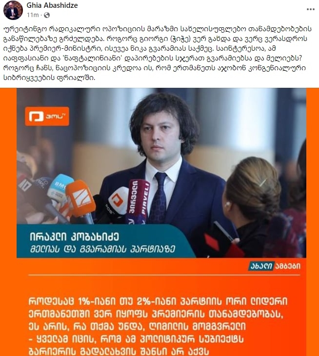 „ურეიტინგო რადიკალური ოპოზიციის მარაზმი სახელისუფლებო თანამდებობების განაწილებაზე გრძელდება. როგორც გიორგი (ჭიჭე) ვერ გახდა და ვერც ვერასდროს იქნება პრემიერმინისტრი, ისევეა ნიკა გვარამიას საქმეც“, – ამის შესახებ ანალიტიკოსი, გია აბაშიძე სოციალურ ქსელში წერს.