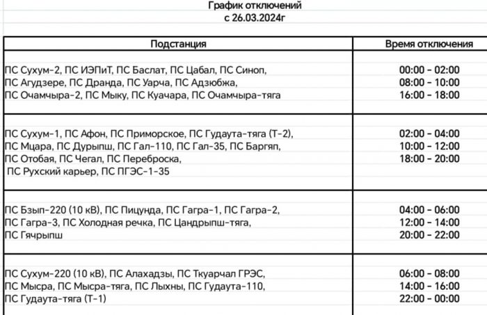 ოკუპირებულ აფხაზეთში ელექტროენერგიის მიწოდების ახალი გრაფიკი ამოქმედდა.