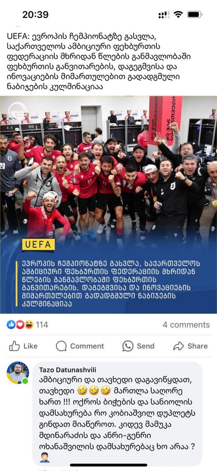 „იმედის“ გავრცელებულ ინფორმაციაზე, სადაც აღნიშნულია, რომ „ევროპის ჩემპიონატზე გასვლა, საქართველოს ამბიციური ფეხბურთის ფედერაციის მხრიდან წლების განმავლობაში ფეხბურთის განვითარების, დაგეგმვისა და ინოვაციების მიმართულებით გადადგმული ნაბიჯების კულმინაციაა“, დათუნაშვილმა კომენტარის სახით გამოხატა უკმაყოფილება.