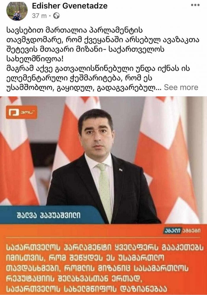სავსებით მართალია პარლამენტის თავმჯდომარე, რომ ქვეყანაში არსებულ ავაზაკთა შეტევის მთავარი მიზანი- საქართველოს სახელმწიფოა! – წერს ექსპერტი ედიშერ გვენეტაძე, რითაც ეხმიანება პარლამენტის თავმჯდომარე შალვა პაპუაშვილის განცხადებას, სადაც აღნიშნულია, რომ “რამდენიმე „ენჯეოს“ წყალობით, მართლმსაჯულების საკითხებში უცხოური ორგანიზაციების მონაწილეობა გაიგივდა მორალურ ტერორთან, ყველაფერ იმასთან, რაც ანტიევროპაა”.