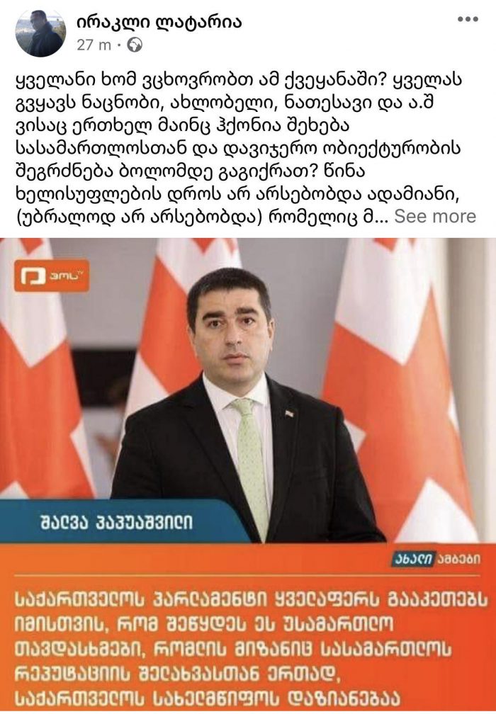 სასამართლოს რომ აკრიტიკებს ნაციონალური მოძრაობა, ეს ხომ ცალკე ანომალიაა, მაგრამ ამაზე ბევრად სამარცხვინო ფაქტია, როდესაც დღევანდელ სასამართლოს ნეგატიურად აფასებენ ის „ენჯეოები“ და ის ევროპელი პოლიტიკოსები, რომლებსაც შენიშვნაც კი არ გამოუხატავთ იმ სასამართლოს მიმართ, სადაც მოქალაქის გამამართლებელი გადაწყვეტილება უბრალოდ არ არსებობდა და სასამართლოს ჰქონდა ნოტარიუსთან პალატის ფუნქცია.., – ასე ეხმიანება ექსპერტი ირაკლი ლატარია, პარლამენტის თავმჯდომარის, შალვა პაპუაშვილის განცხადებას, რომლის თქმითაც, საქართველოს პარლამენტი ყველაფერს გააკეთებს იმისთვის, რომ შეწყდეს უსამართლო თავდასხმები, რომლის მიზანიც სასამართლოს რეპუტაციის შელახვასთან ერთად, საქართველოს სახელმწიფოს დაზიანებაა.