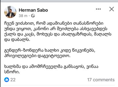 “გირჩის” ერთ-ერთი ლიდერი, ჰერმან საბო მისი პარტიის ინიციატივაზე, გენდერული კვოტირების გაუქმების შესახებ, სოციალურ ქსელში წერს.