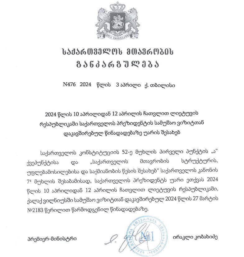 პრეზიდენტმა მთავრობას ლიეტუვის რესპუბლიკაში, ქალაქ ვილნიუსში სამუშაო ვიზიტთან დაკავშირებით 2024 წლის 27 მარტს მიმართა.