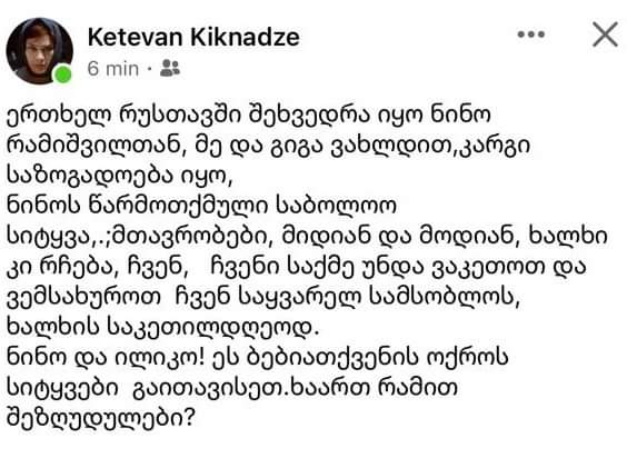 ქეთევან კიკნაძე – სუხიშვილებს: ნინო და ილიკო! ნინო რამიშვილის ოქროს სიტყვები გაითავისეთ: „მთავრობები მიდიან და მოდიან, ხალხი კი რჩება, ჩვენ, ჩვენი საქმე უნდა ვაკეთოთ და ვემსახუროთ ჩვენს საყვარელ სამშობლოს ხალხის საკეთილდღეოდ“ – ხართ რამით შეზღუდულები?