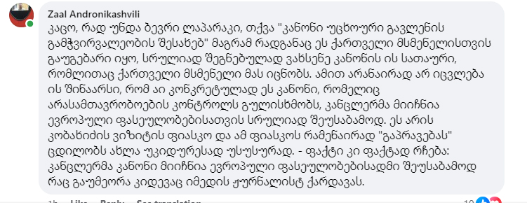 „კაცო, რად უნდა ბევრი ლაპარაკი, თქვა კანონი უცხოური გავლენის გამჭვირვალობის შესახებ, მაგრამ რადგან ეს ქართველი მსმენელისთვის გაუგებარი იყო, სრულიად შეგნებულად ვახსენე კანონის ის სათაური, რომლითაც მას ქართველი მსმენელი იცნობს. ამით არანაირად არ იცვლება ის შინაარსი, რომ კონკრეტულად ეს კანონი, რომელიც არასამთავრობოების კონტროლს გულისხმობს, კანცლერმა მიიჩნია ევროპული ფასეულობებისთვის სრულიად შეუსაბამოდ“, – წერს ზაალ ანდრონიკაშვილი.