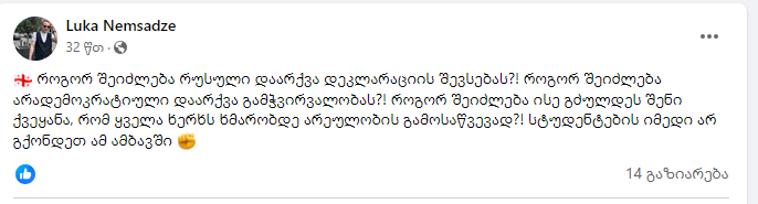 „როგორ შეიძლება, რუსული დაარქვა დეკლარაციის შევსებას?! როგორ შეიძლება არადემოკრატიული დაარქვა გამჭვირვალობას?! როგორ შეიძლება ისე გძულდეს შენი ქვეყანა, რომ ყველა ხერხს ხმარობდე არეულობის გამოსაწვევად?! სტუდენტების იმედი არ გქონდეთ ამ ამბავში“, – ლუკა ნემსაძე.