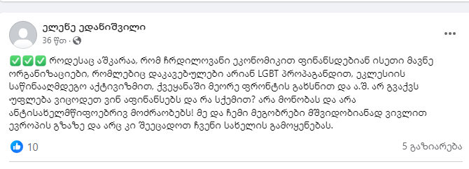 როდესაც აშკარაა, რომ ჩრდილოვანი ეკონომიკით ფინანსდებიან ისეთი მავნე ორგანიზაციები, რომლებიც დაკავებულები არიან LGBT პროპაგანდით, ეკლესიის საწინააღმდეგო აქტივიზმით, ქვეყანაში მეორე ფრონტის გახსნით და ა.შ. არ გვაქვს უფლება ვიცოდეთ ვინ აფინანსებს და რა სქემით?, – წერს სოციალურ ქსელში ბათუმის უნივერსიტეტის სტუდენტი, ელენე ედანიშვილი.