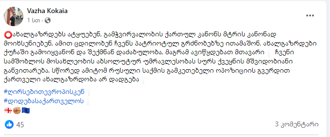 ახალგაზრდებს ატყუებენ, გამჭვირვალობის ქართულ კანონს მტრის კანონად მოიხსენიებენ, ამით ცდილობენ ჩვენს პატრიოტულ გრძნობებზე ითამაშონ, ახალგაზრდები ქუჩაში გამოიყვანონ და შექმნან დაძაბულობა – ამის შესახებ სოციალურ ქსელში „ქართული ოცნების“ ახალგაზრდული ორგანიზაციის წევრი, ვაჟა კოკაია წერს.